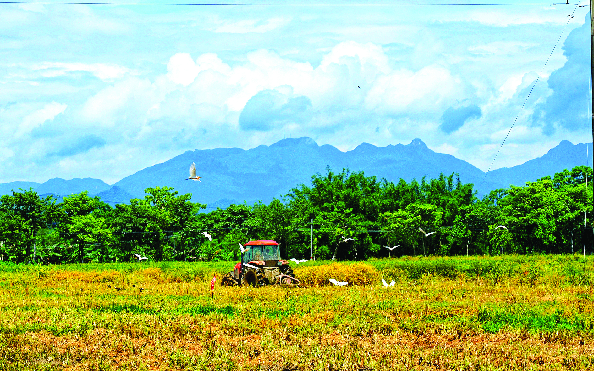 在橫瀝鎮(zhèn)新榮村的田野上,早稻收割忙,鳥(niǎo)兒覓食歡,一派和諧景象。