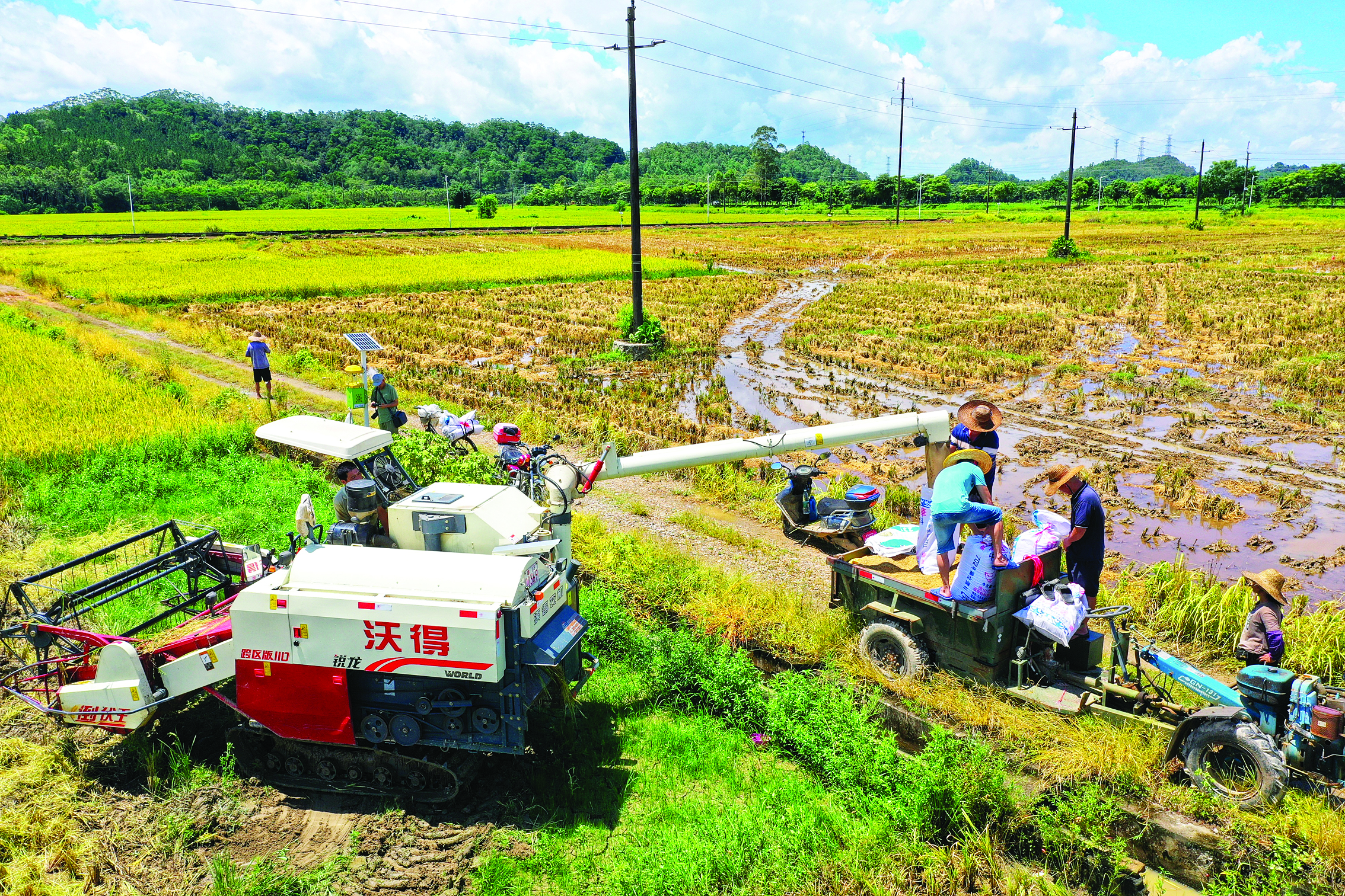 村民齊心將收割的稻谷裝袋。
