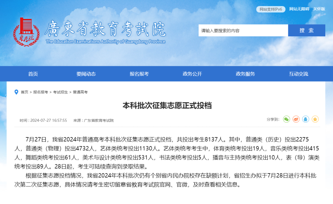 7月27日,廣東2024年普通高考本科批次征集志愿正式投檔,共投出考生8137人。目前,仍有個(gè)別省內(nèi)民辦院校存在缺額計(jì)劃,省招生辦擬于7月28日進(jìn)行本科批次第二次征集志愿。