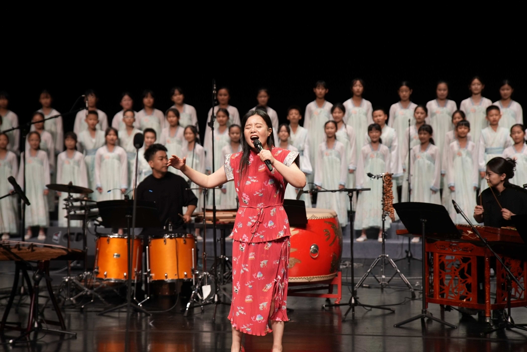 音樂會每到一城,龔琳娜都會與當(dāng)?shù)貎和铣獔F合作。本次來到惠州,龔琳娜與惠州市第十一小學(xué)金榜分校合唱團合作了《木瓜》《夢想號子》,其中《木瓜》選自《詩經(jīng)·衛(wèi)風(fēng)》。“很多地方的兒童合唱團都是通過青少年宮精挑細選后組成的,沒想到惠州一所小學(xué)有這么多優(yōu)秀的孩子,不但音準(zhǔn)節(jié)奏好,精氣神也很飽滿。我希望孩子們在臺上演唱《詩經(jīng)》的時候,能夠?qū)鹘y(tǒng)文化保持一種自豪感,這樣他們以后再去學(xué)古詩詞,再去了解我們的民歌,就不會覺得很遙遠了。”龔琳娜說。