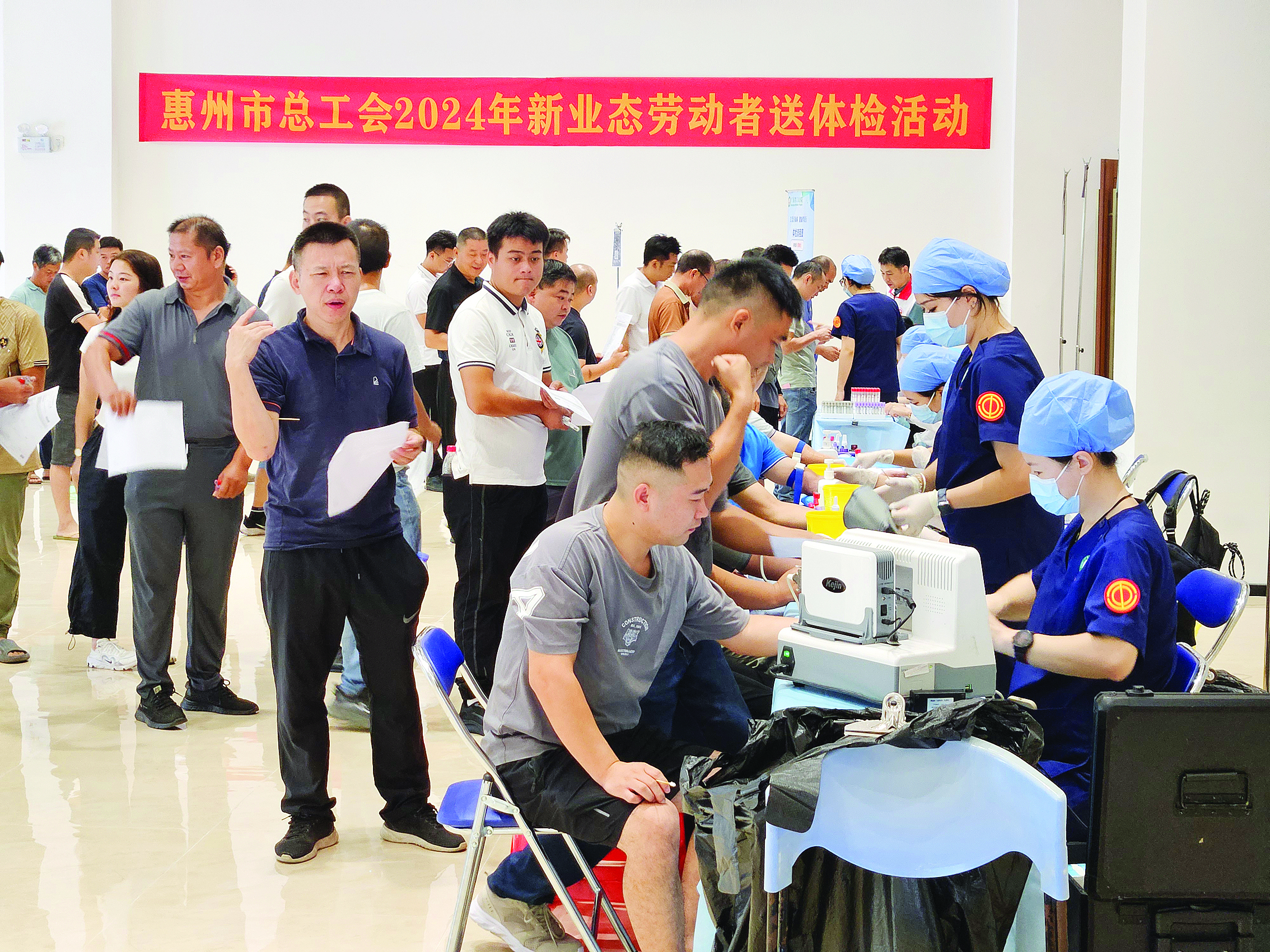 廣東省工人醫(yī)院專業(yè)醫(yī)護(hù)團(tuán)隊(duì)為惠州新業(yè)態(tài)勞動(dòng)者體檢。 惠州日報(bào)記者游璇鈺 通訊員沈瑩 攝