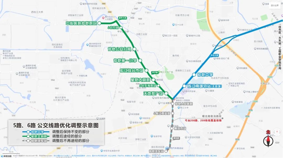 線路調(diào)整:取消5路仲愷人民醫(yī)院、陳江商業(yè)街、集成市場(chǎng)、仲愷汽車(chē)站等4個(gè)站點(diǎn),改由曙光路口延伸經(jīng)甲子路、康僑大道至中心醫(yī)院仲愷院區(qū)。
