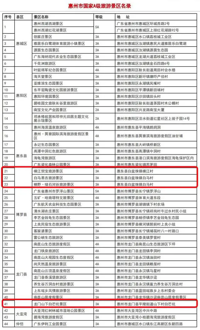《惠州市國家A級旅游景區(qū)名冊》