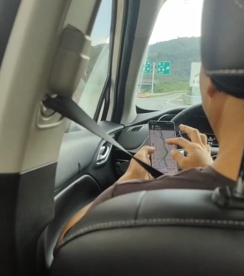 在高速公路上,網(wǎng)約車司機一邊開車一邊使用手機看導航,嚇壞了乘客。