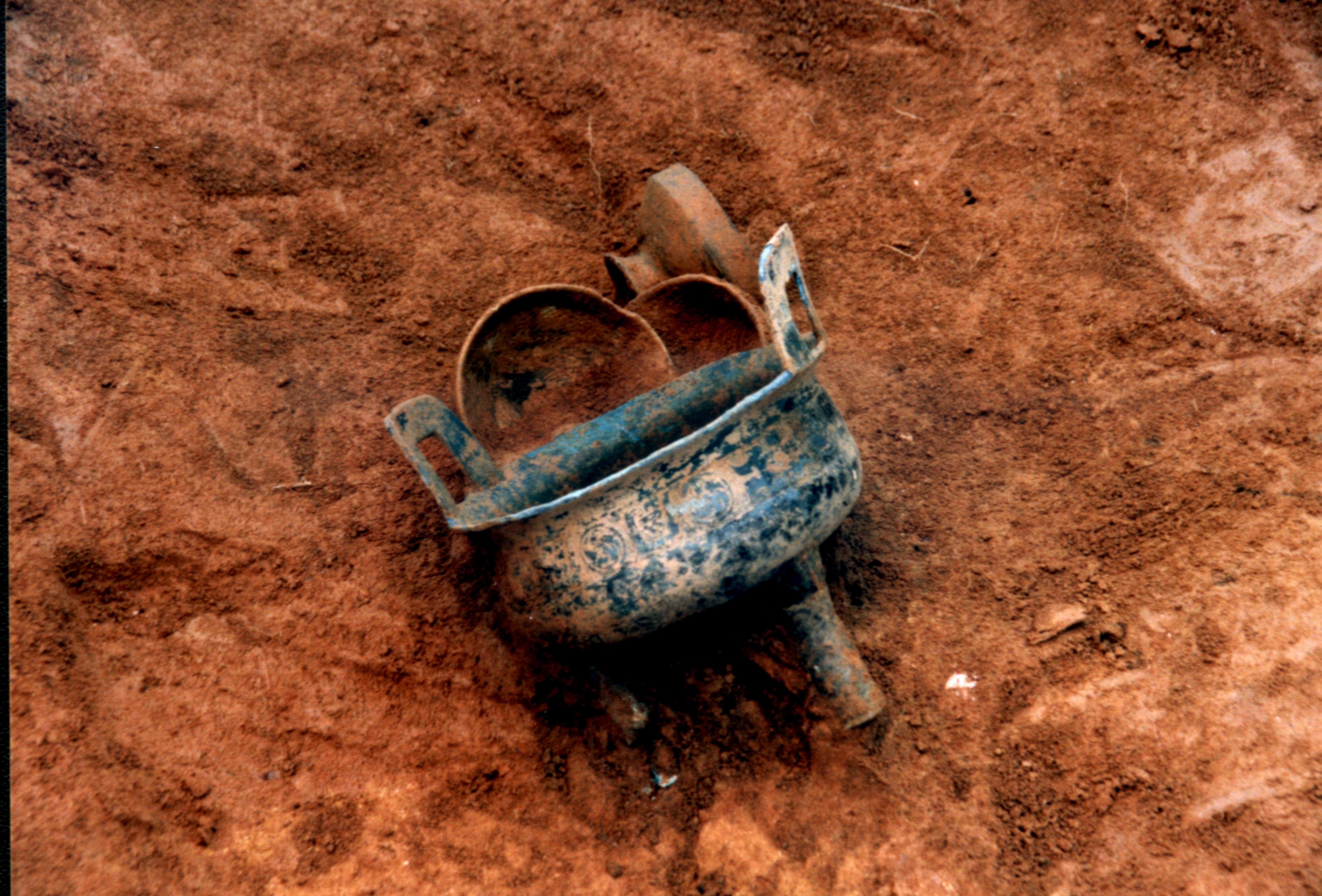 博羅橫嶺山墓地出土的圓渦與夔龍組合紋銅鼎。