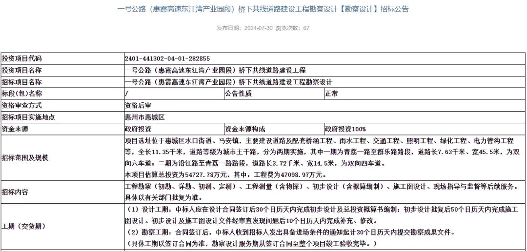 近日,惠州市公共資源交易中心發(fā)布了《一號公路(惠霞高速東江灣產(chǎn)業(yè)園段)橋下共線道路建設工程勘察設計【勘察設計】招標公告》。