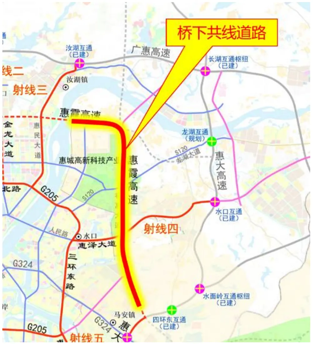 根據(jù)公告顯示,一號公路(惠霞高速東江灣產(chǎn)業(yè)園段)將建11.35公里長的橋下共線道路,與1號公路(惠霞高速)AK13~AK24段形成復合廊道。