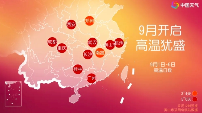 9月2日至3日,黃淮、江淮、江南東部高溫逐漸消減,之后9月4日至5日高溫又會向東擴張。預計未來10天,四川盆地、江漢、江南、華南等地高溫日數將有5~10天,其中四川、重慶、湖北、湖南、江西、浙江等部分地區(qū)最高氣溫可達40℃~43℃。