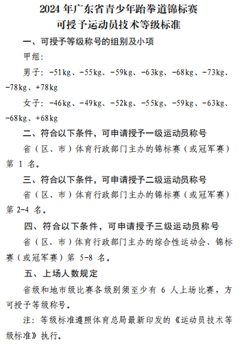 廣東省青少年跆拳道錦標(biāo)賽是年度全省競技水平最高、參賽規(guī)模最大的跆拳道專業(yè)賽事,在比賽(甲組)中取得相應(yīng)成績的運(yùn)動員可授予國家一級、二級、三級運(yùn)動員。