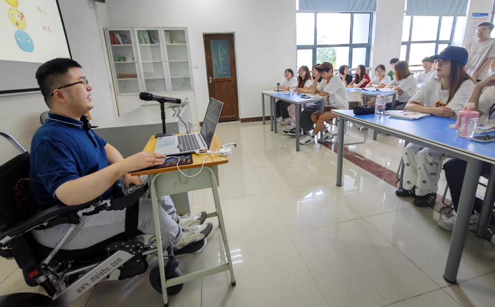 第一次面對學生,陳斌緊張了。坐在輪椅上的他,肢體語言不豐富,只能用實際內(nèi)容和口頭語言來吸引學生。
