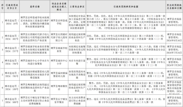 關(guān)注查處情況,5家被立案學(xué)校分別為:博羅縣京師薈成學(xué)校、博羅縣石灣鎮(zhèn)時(shí)代驕子幼兒園有限公司、博羅縣銀溪學(xué)校食堂、博羅縣福田中心小學(xué)和博羅縣福田鎮(zhèn)福慧星幼兒園。