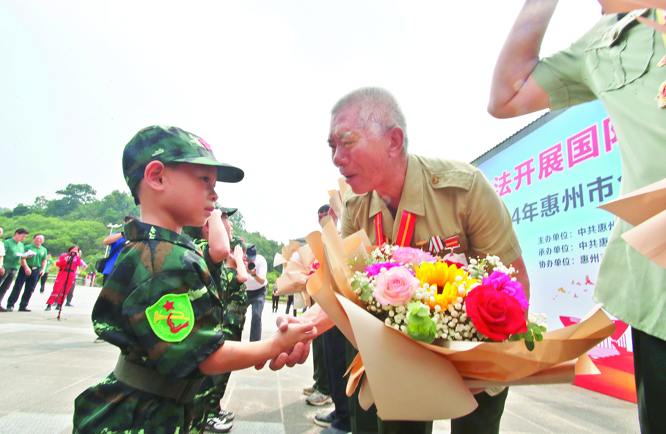 “國(guó)防教育小兵”向國(guó)家一等功臣代表獻(xiàn)花致敬。惠州日?qǐng)?bào)記者鐘暢新 攝