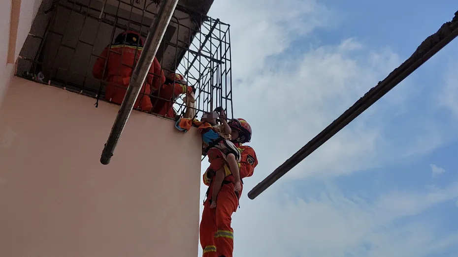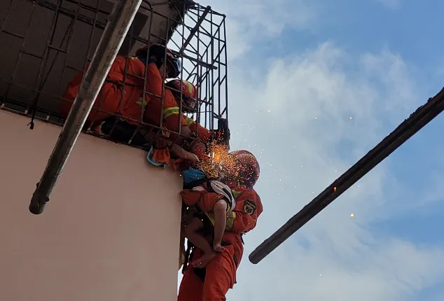 現(xiàn)場(chǎng)消防員先對(duì)小孩進(jìn)行固定保護(hù),隨后在小孩旁邊的位置進(jìn)行破拆防護(hù)窗。為防止小孩在破拆作業(yè)時(shí)被燙傷,救援人員一邊灑水進(jìn)行降溫,一邊使用毛巾為小孩抵擋濺射的火星。經(jīng)過(guò)近20分鐘的緊急救援,小孩成功脫困。