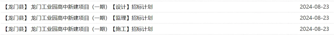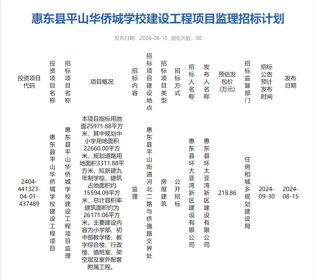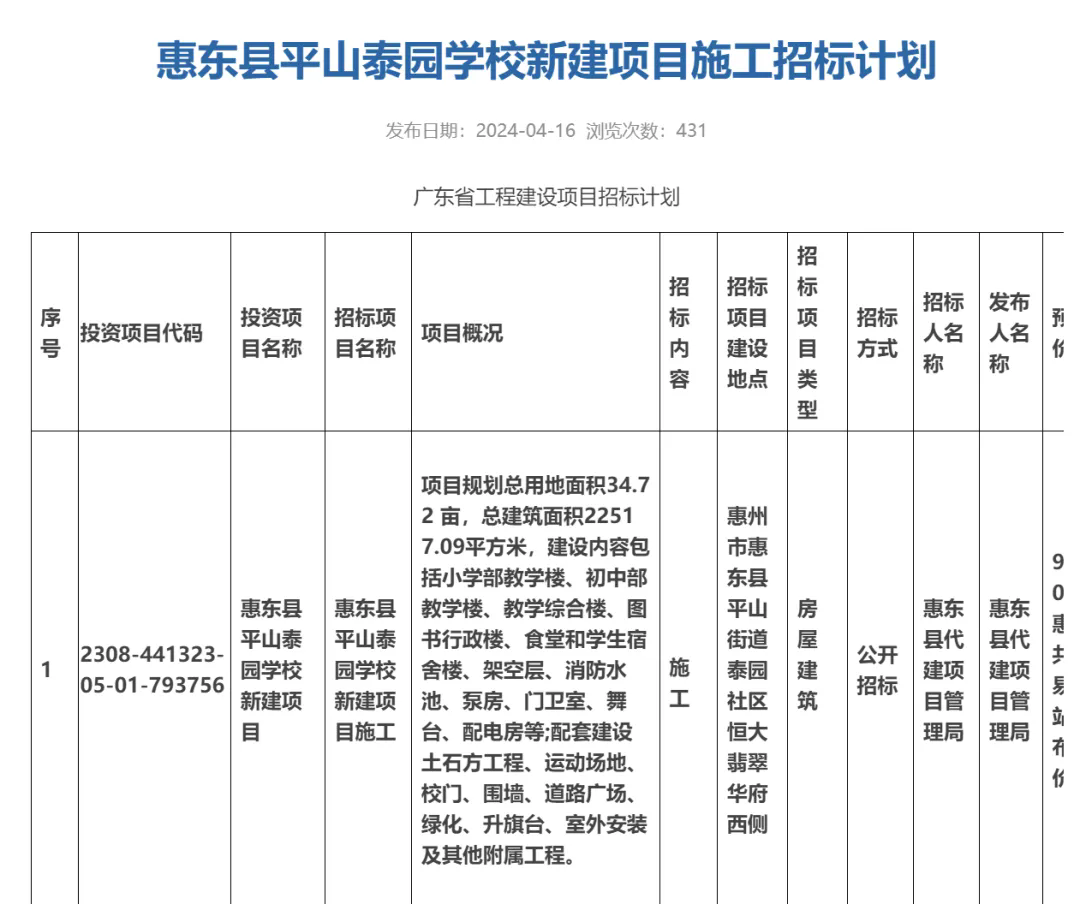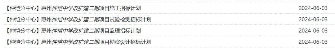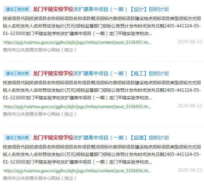 此外,惠州市公共資源交易中心還發(fā)布了龍門平陵實驗學校改擴建高中項目(一期)設(shè)計、施工和監(jiān)理招標計劃。