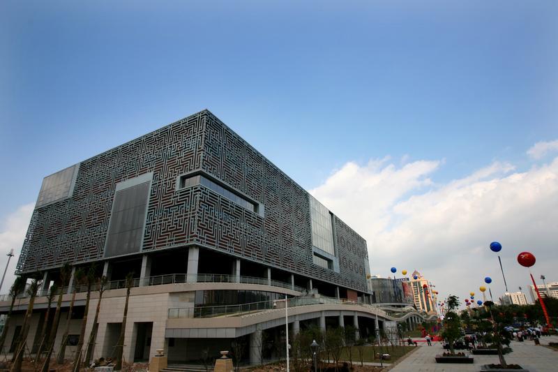 惠州博物館外觀設計象征“歷史之印”,大量使用先秦時期東江流域出土的陶器網(wǎng)格紋元素作為裝飾,厚重而典雅。