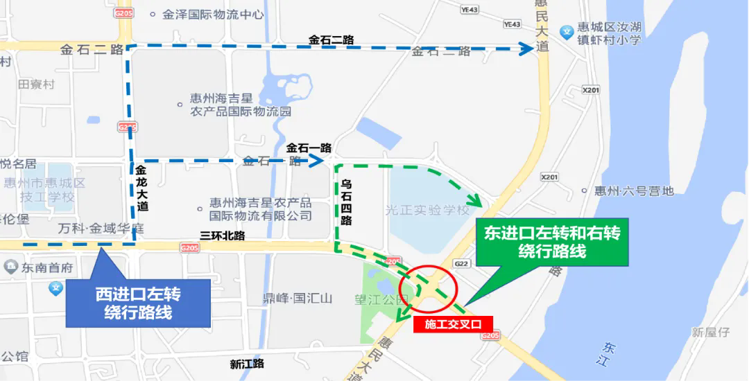 施工期間,原從北進口直行和左轉(zhuǎn)車輛,可通過金石一路→烏石四路→三環(huán)北路等道路繞行;原從南進口直行或左轉(zhuǎn)的車輛,可通過新江路→金龍大道等道路繞行。