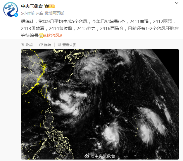 據(jù)@中央氣象臺(tái)消息,據(jù)統(tǒng)計(jì),常年9月平均生成5個(gè)臺(tái)風(fēng),今年已經(jīng)編號(hào)6個(gè),2411“摩羯”,2412“麗琵”,2413“貝碧嘉”,2414“普拉桑”,2415“蘇力”,2416“西馬侖”,目前還有1~2個(gè)臺(tái)風(fēng)胚胎在等待編號(hào)。