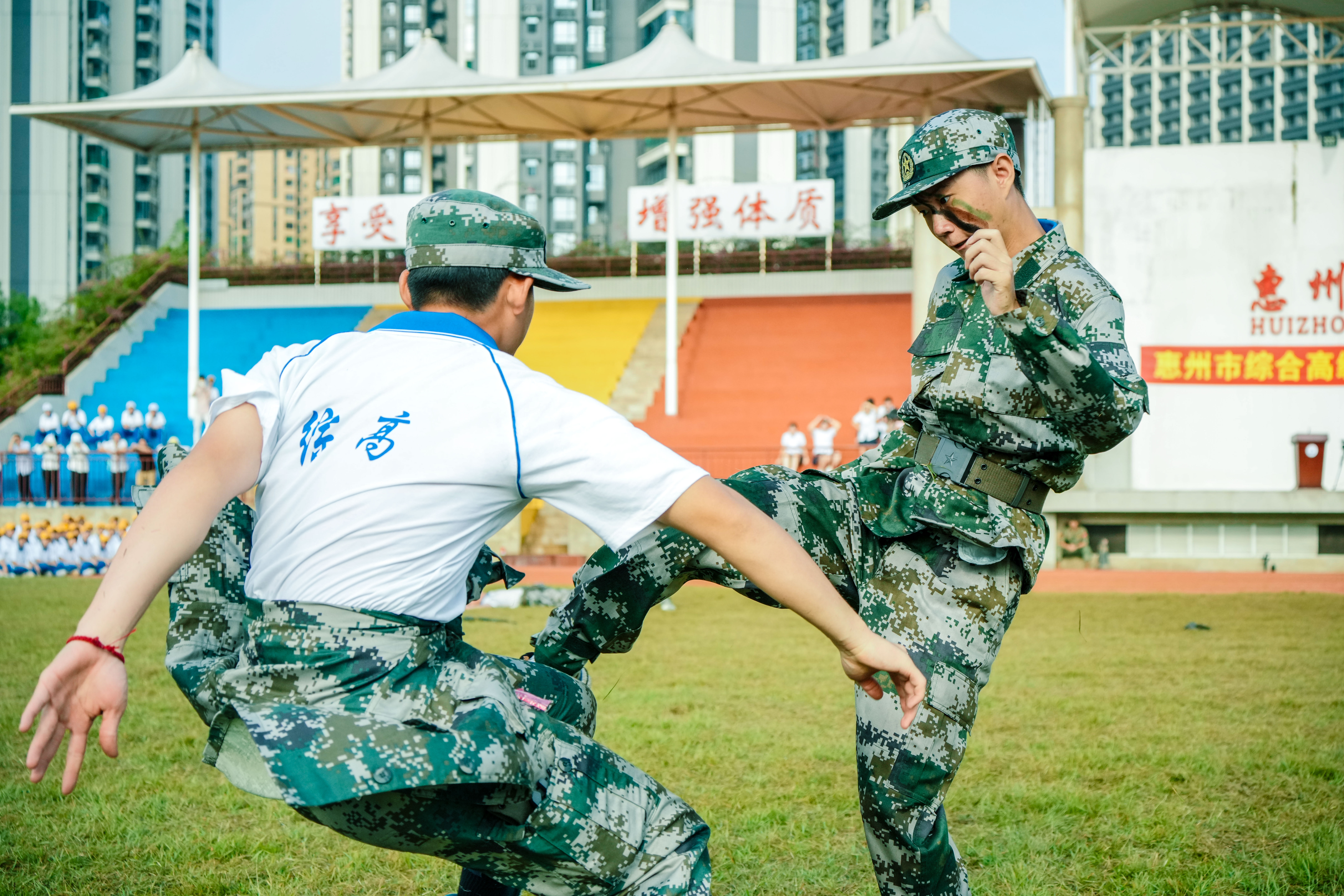 軍事科目展演精彩紛呈,從干凈利落的擒敵拳、軍體拳,到行云流水的匕首操、刺殺操,再到場面火爆的戰(zhàn)術(shù)基礎(chǔ)動作。一令一動蘊(yùn)含鋼鐵意志,一招一式盡展少年英姿。