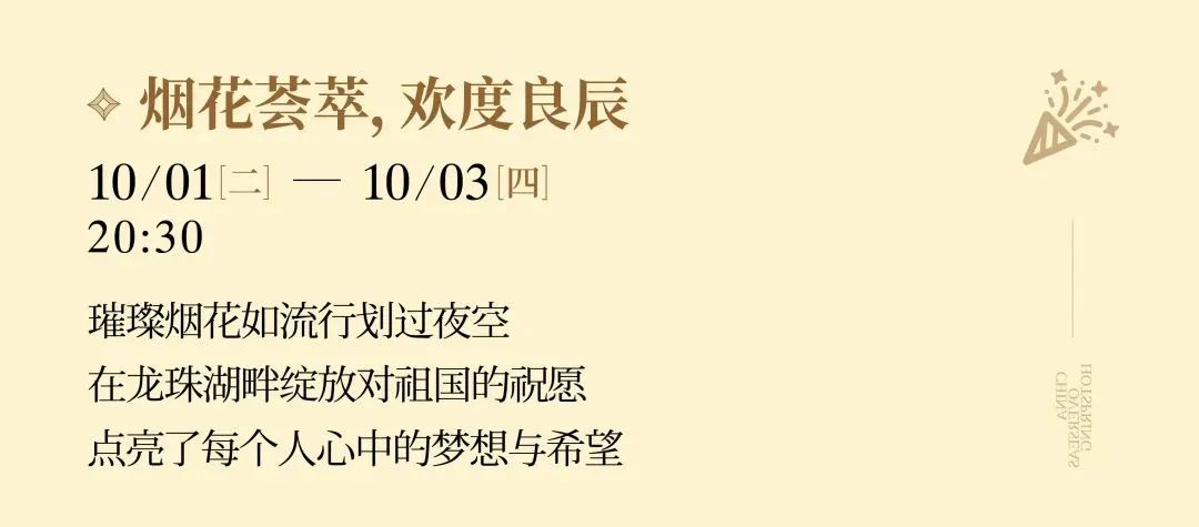 晚上:(10月1日-10月5日,國慶專屬夜場表演:非遺火壺、野人噴火、國風舞蹈)、幻樂千花光影秀。