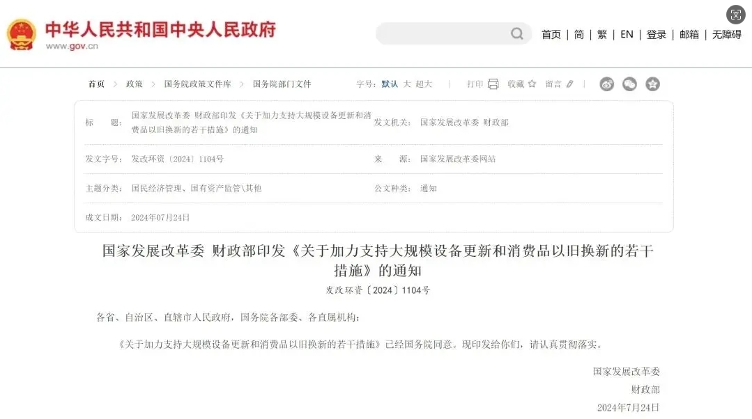 2024年7月24日,國家發(fā)展改革委、財政部印發(fā)了《關(guān)于加力支持大規(guī)模設(shè)備更新和消費品以舊換新的若干措施》的通知,提出要從今年發(fā)行的特別國債中,拿出3000億元用于支持設(shè)備更新、消費品以舊換新活動。