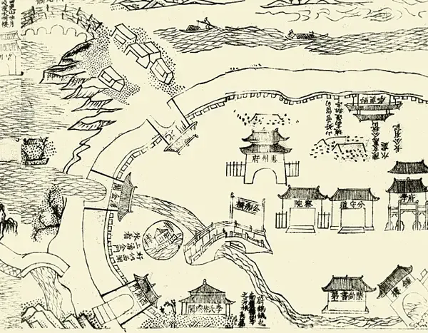 明代《惠景全圖》 圖中可看到穿府城而過的鵝湖,西湖水從碧水關(guān)入城,經(jīng)公卿橋,由鐘樓注入西枝江 (圖片來源:惠州發(fā)布)