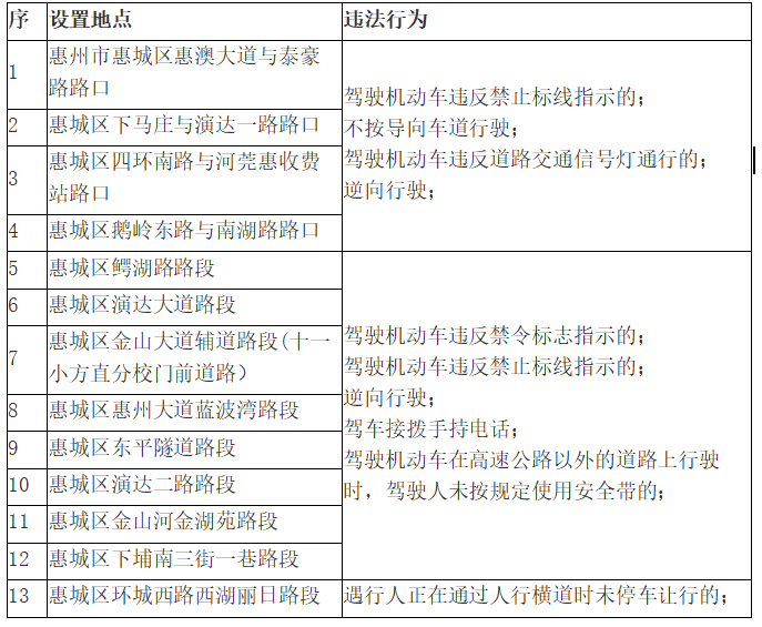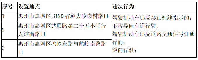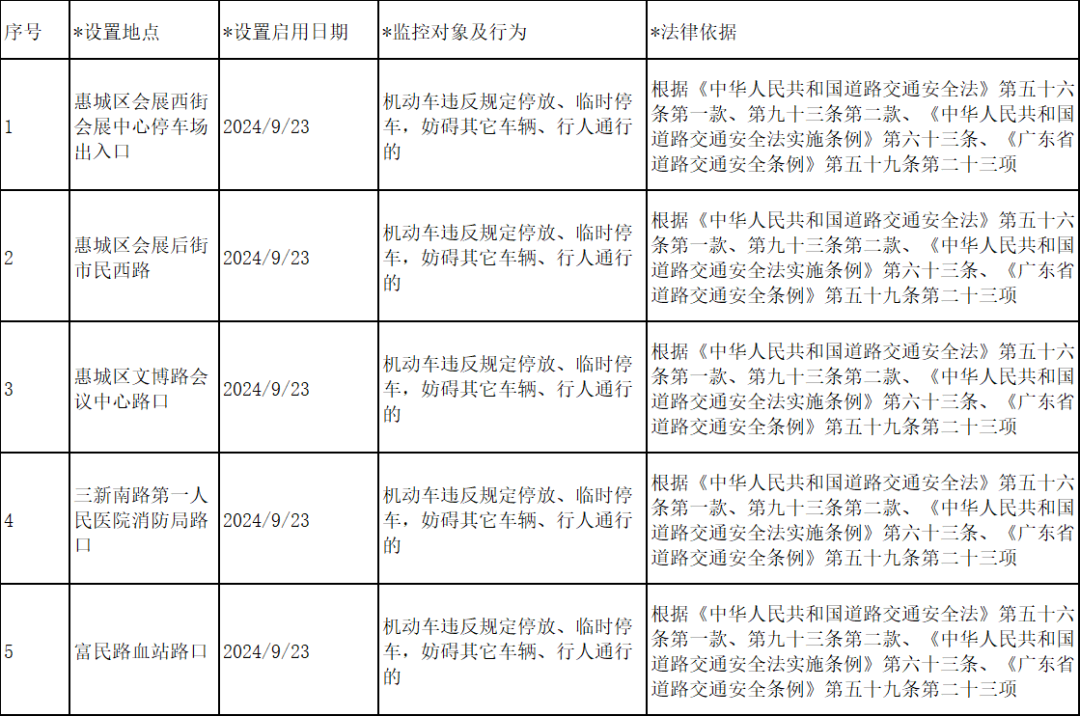 根據(jù)《中華人民共和國行政處罰法》第四十一條及《道路交通安全違法行為處理程序規(guī)定》第十六條關(guān)于“固定式交通技術(shù)監(jiān)控設(shè)備地點(diǎn)應(yīng)向社會公布”的規(guī)定,惠州市轄區(qū)范圍內(nèi)近期啟用的視頻監(jiān)控點(diǎn)位公布,具體如下:
