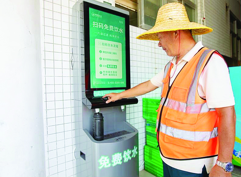 環(huán)衛(wèi)工人在直飲水機(jī)前接水。