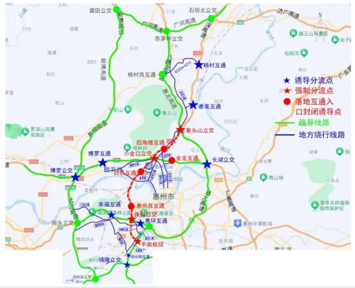 長深高速深圳往河源方向車輛可從珠田樞紐互通繞行惠大高速、惠龍高速、廣河高速通行;長深高速四角樓往深圳方向車輛可通過G205國道或繞行惠龍高速通行。