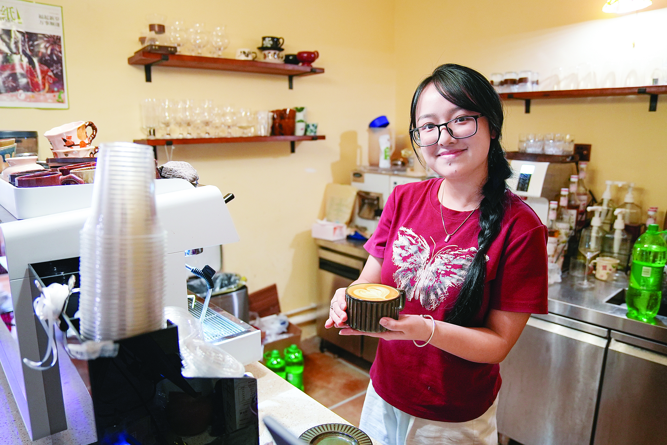 午后的“河畔cafe”客人不多,陽光透過百葉窗照在藤椅上,留聲機(jī)里傳來悠揚(yáng)的旋律、吧臺后面飄出陣陣咖啡香氣……不少來店里“打卡”過的年輕人稱這里“自帶復(fù)古氣息”又有“度假的松弛感”。