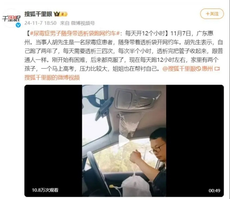 近日,有網(wǎng)民發(fā)視頻稱,惠州有一名患尿毒癥的男子,隨身帶透析袋跑網(wǎng)約車,引發(fā)不少關(guān)注。該男子每天透析三四次,每次半小時,透析完繼續(xù)跑車,已堅持兩年,不少網(wǎng)友對男子樂觀的生活態(tài)度表示敬佩,希望男子平安健康。
