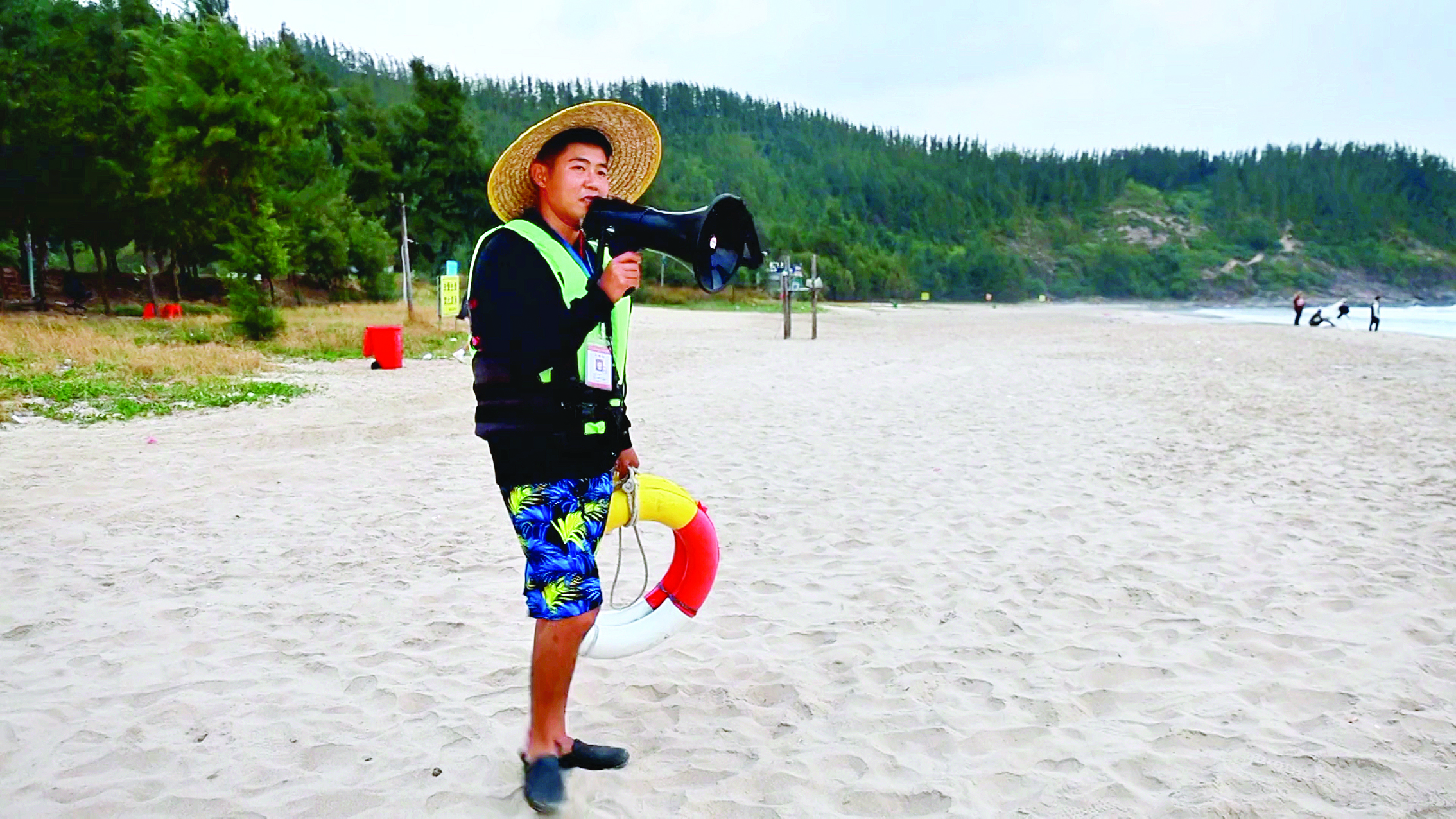 楊守源在黑排角海邊宣傳防溺水。惠州日報記者湯渝杭 攝