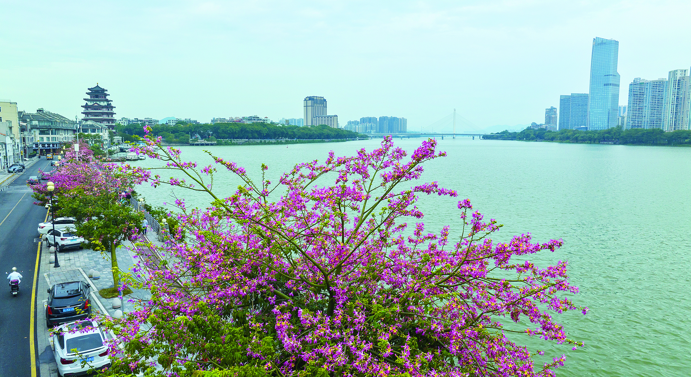 近日,惠州市區(qū)水東街的美麗異木棉進(jìn)入盛花期,滿樹姹紫嫣紅,粉色的小花在蜿蜒的枝條上綻放,宛若靈動飛舞的蝴蝶,吸引不少路人駐足賞花,打卡拍照。