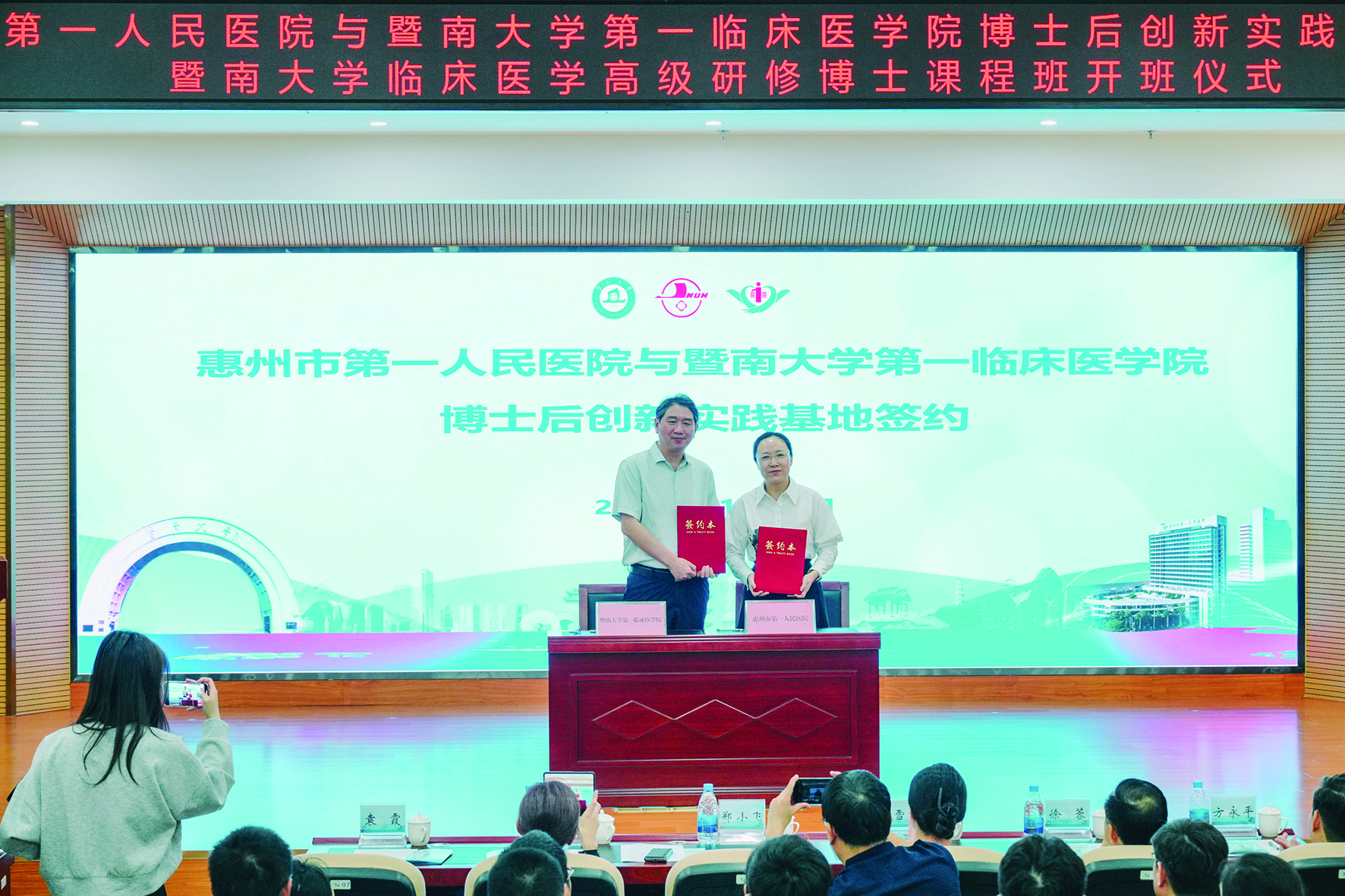 惠聚英才謀發(fā)展,醫(yī)心為民譜新篇。11月11日上午,惠州市第一人民醫(yī)院(簡稱“市一院”)與暨南大學(xué)第一臨床醫(yī)學(xué)院博士后創(chuàng)新實(shí)踐基地簽約暨暨南大學(xué)臨床醫(yī)學(xué)高級研修博士課程班開班儀式舉行,標(biāo)志著市一院在科研創(chuàng)新與人才培養(yǎng)上邁出了重要的一步。