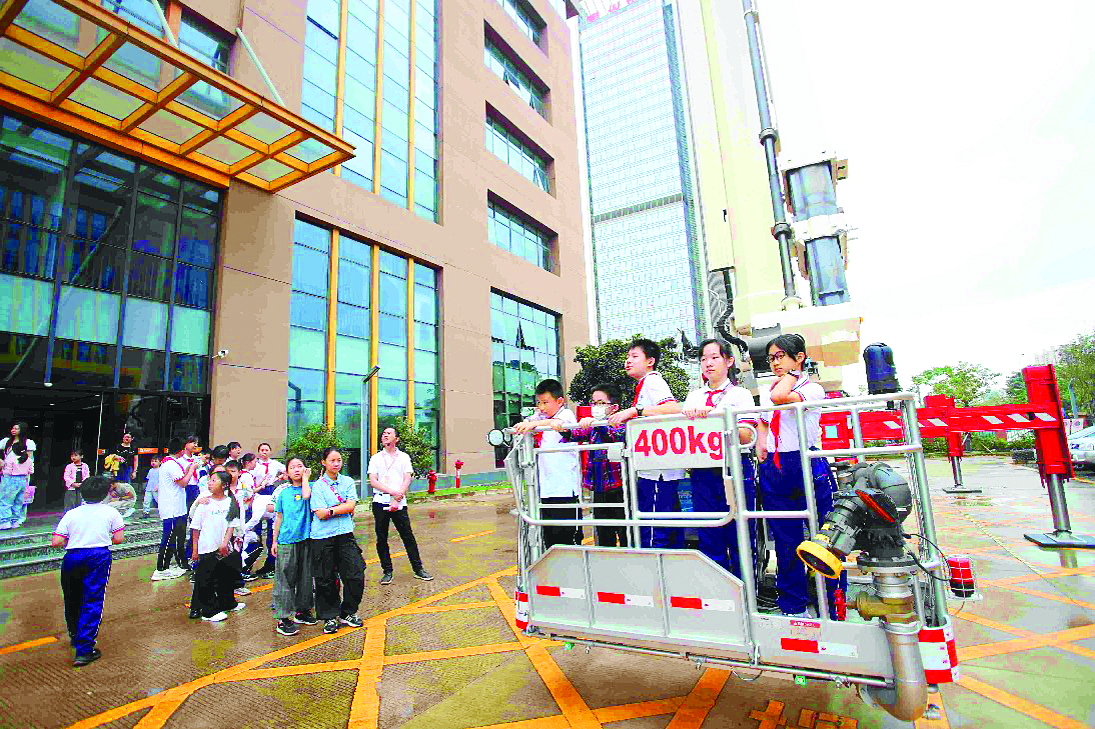 孩子們現(xiàn)場體驗登高云梯車工作斗登高救援。惠州日報記者鐘暢新 攝