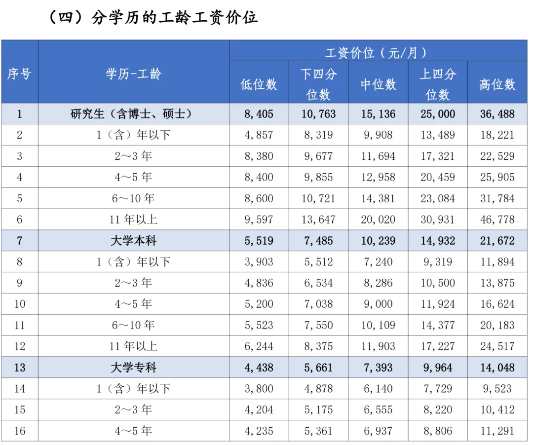 工作經(jīng)驗(yàn)的積累與薪酬增長(zhǎng)密切相關(guān)。研究生普遍中位數(shù)薪資在15136元/月,初中學(xué)歷則普遍中位數(shù)薪資在5441元/月。