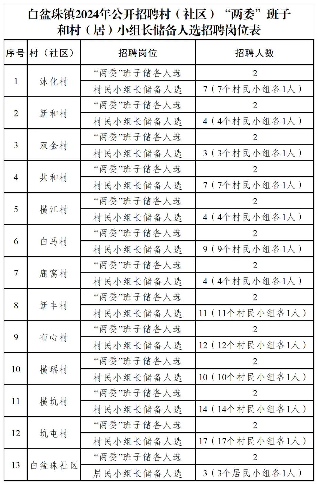 本次招聘村(社區(qū))“兩委”班子儲備人選職位26個,村(居)民小組長儲備人選職位105個。
