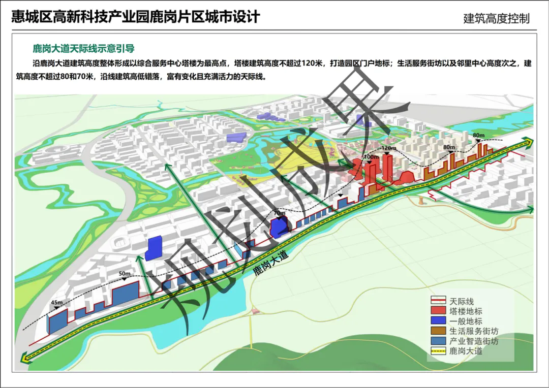 其中,沿鹿崗大道建筑高度整體形成以綜合服務中心塔樓為最高點,塔樓建筑高度不超過120米,打造園區(qū)門戶地標;生活服務街坊以及鄰里中心高度次之,建筑高度不超過80和70米,沿線建筑高低錯落,富有變化且充滿活力的天際線。