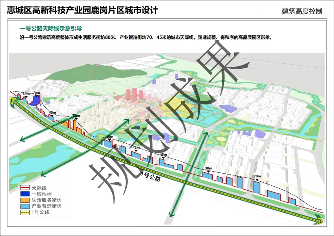 沿一號公路建筑高度整體形成生活服務街坊80米、產(chǎn)業(yè)智造街坊70、45米的城市天際線,塑造規(guī)整、有秩序的高品質(zhì)園區(qū)形象。
