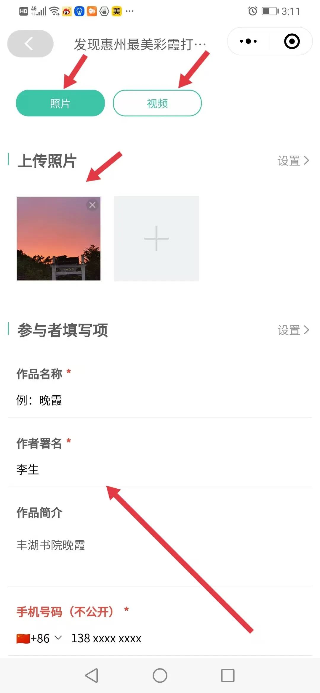 3、選擇你要提交的作品類型,填寫作品名稱、作者署名、手機號碼等選項,最后按提交按鈕即可上傳素材。