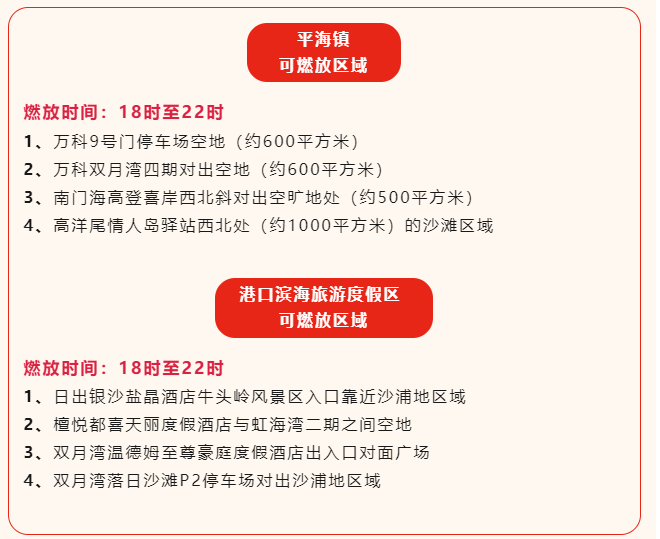 (一)平海鎮(zhèn)劃定萬科9號門停車場空地(約600平方米);萬科雙月灣四期對出空地(約600平方米);南門海高登喜岸西北斜對出空曠地處(約500平方米);高洋尾情人島驛站西北處(約1000平方米)沙灘區(qū)域為限時可燃放區(qū),將18時至22時規(guī)定為可燃放時間(紅色區(qū)域為禁燃范圍)。