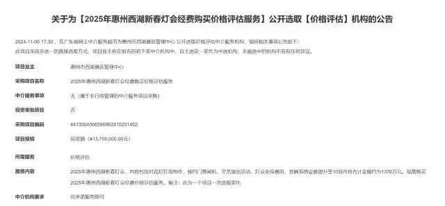 發(fā)布《關(guān)于為【2025年惠州西湖新春燈會經(jīng)費購買價格評估服務】