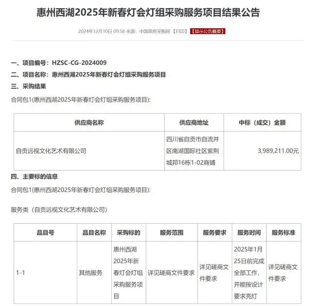 2024年新春,農(nóng)歷臘月二十八日(2024年2月7日)西湖花燈亮燈閃耀全城。2025年新春花燈又將何時點亮?據(jù)中國政府采購網(wǎng)發(fā)布的最新信息顯示,當前,自貢遠視文化藝術(shù)有限公司已正式以3989211元的價格成功中標惠州西湖2025年新春燈會燈組采購服務項目,合同約定在2025年1月25日前完成全部工作,并能按設計要求亮燈。