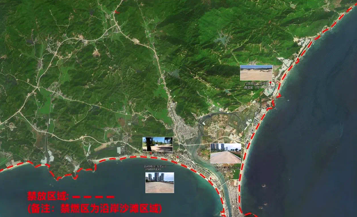 (一)平海鎮(zhèn)劃定萬科9號門停車場空地(約600平方米);萬科雙月灣四期對出空地(約600平方米);南門海高登喜岸西北斜對出空曠地處(約500平方米);高洋尾情人島驛站西北處(約1000平方米)沙灘區(qū)域為限時可燃放區(qū),將18時至22時規(guī)定為可燃放時間(紅色區(qū)域為禁燃范圍)。