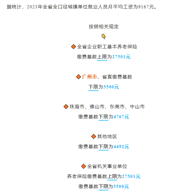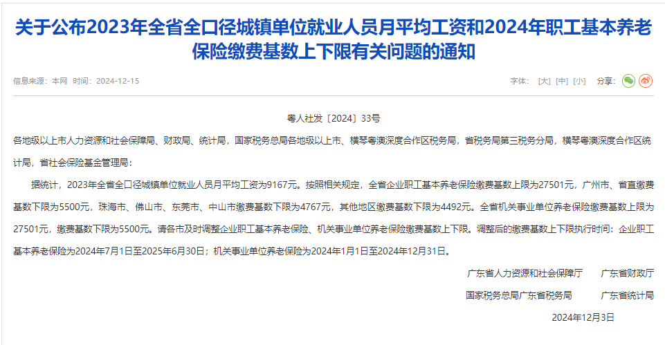 廣東發(fā)布2024年職工基本養(yǎng)老保險繳費基數(shù)上下限