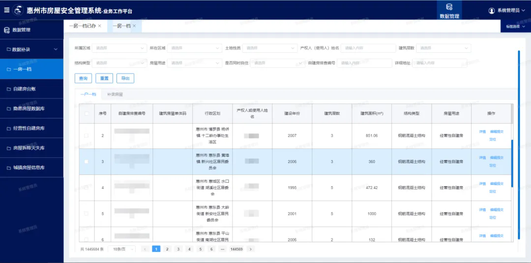 惠州市房屋安全管理系統(tǒng)是面向全市的監(jiān)管平臺,可實現(xiàn)市、縣(區(qū))、鄉(xiāng)鎮(zhèn)、村多級聯(lián)動一屏監(jiān)管,可方便各級政府部門全面掌握所轄區(qū)域自建房建設、安全、危房等情況。