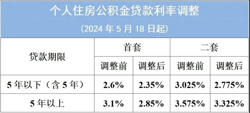 根據(jù)《中國人民銀行關(guān)于下調(diào)個(gè)人住房公積金貸款利率的通知》,市公積金中心自2024年5月18日起,下調(diào)個(gè)人住房公積金貸款利率0.25個(gè)百分點(diǎn),即調(diào)整如下: