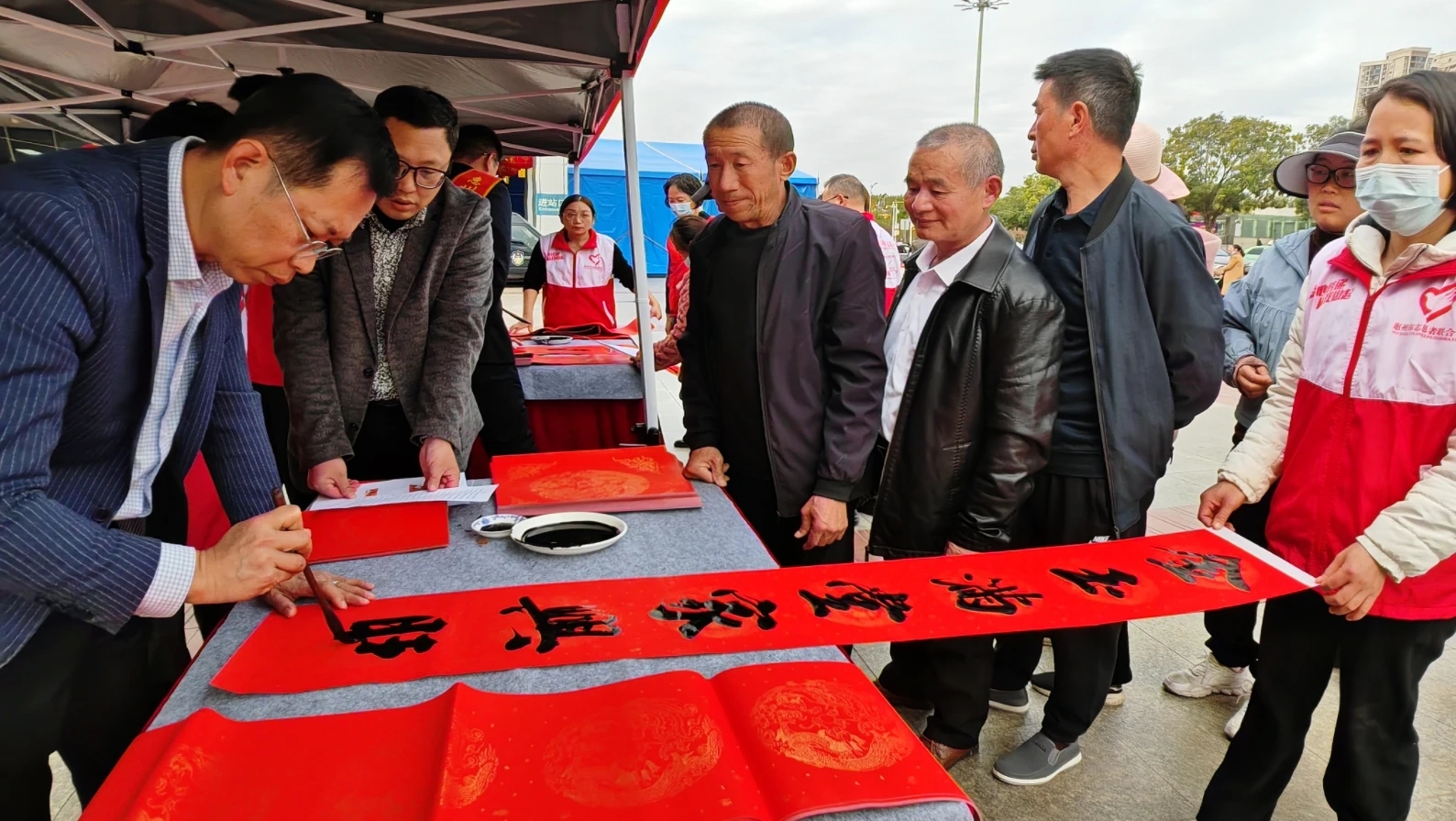 “諸事皆宜多喜樂,未來可期長(zhǎng)安寧。”來自江西南昌的姜樟春滿心歡喜地看著墨跡未干的春聯(lián)。姜樟春在惠州從事建筑行業(yè),說起在惠州工作的感受,他高興地說,來惠州工作三年來,最大的感受就是惠州環(huán)境美、市民熱情,“每年春運(yùn)回家都享受志愿者提供的暖心服務(wù),今天還幸運(yùn)地領(lǐng)取到書法家現(xiàn)場(chǎng)書寫的春聯(lián),內(nèi)心暖暖的。”