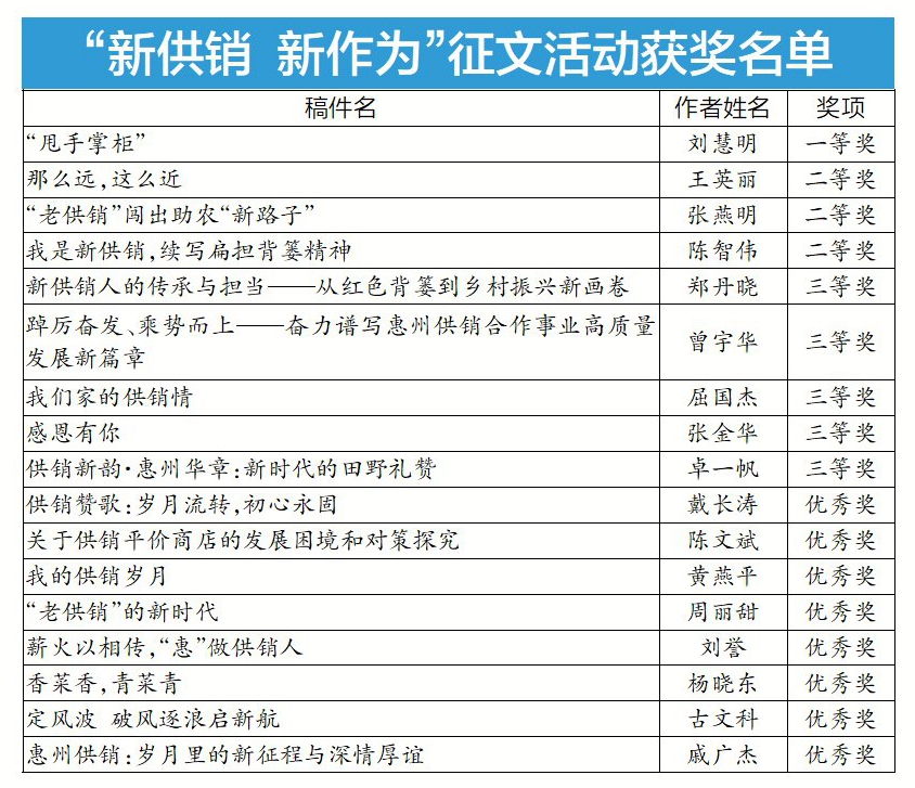 惠州日?qǐng)?bào)訊 (記者劉建威 通訊員郭權(quán))由惠州市供銷(xiāo)合作聯(lián)社舉辦的“新供銷(xiāo) 新作為”第二屆供銷(xiāo)主題征文活動(dòng)獲獎(jiǎng)名單正式出爐。本次共評(píng)出一等獎(jiǎng)1名、二等獎(jiǎng)3名、三等獎(jiǎng)5名、優(yōu)秀獎(jiǎng)8名,獲獎(jiǎng)作品將擇優(yōu)在《惠州日?qǐng)?bào)》、今日惠州網(wǎng)展示。