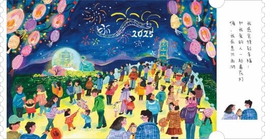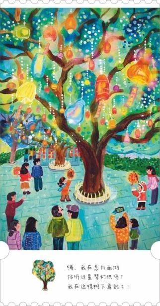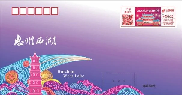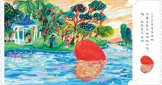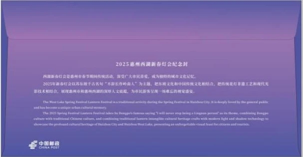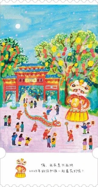 正面:惠州西湖,新春燈會璀璨奪目。門樓熠熠生輝,象征著新年的紅火與吉祥。金蛇舞獅靈動,為新年祈福,為人們帶來好運。人群熙攘笑開顏,共賞明月映湖、亭臺樓閣,嶺南風情盡顯,“不辭長作嶺南人”,盡顯西湖獨特韻味。