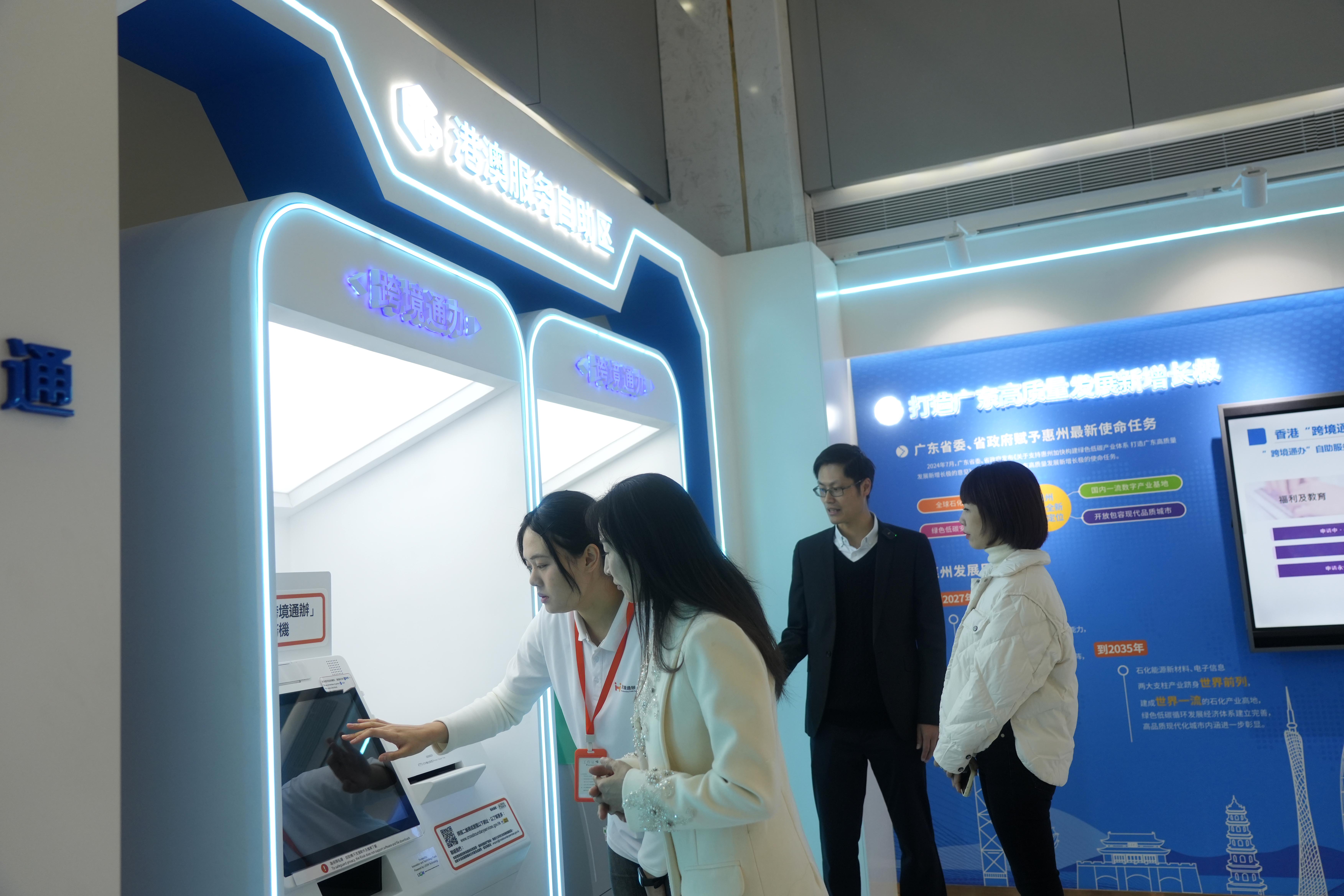 為進一步方便港澳居民來惠創(chuàng)業(yè)就業(yè)、生活學(xué)習(xí),2024年,惠州市政務(wù)服務(wù)中心先后啟用惠州粵港澳大灣區(qū)(港澳服務(wù))專區(qū)、香港“跨境通辦”自助服務(wù)機及“智方便”自助登記站。前者可為港澳企業(yè)、居民提供超300項涉港澳政務(wù)服務(wù)事項的辦理,后者提供11個相關(guān)部門共70項政務(wù)服務(wù),涵蓋稅務(wù)、公司注冊、醫(yī)療健康、出入境檢查及緊急求助等多個領(lǐng)域。